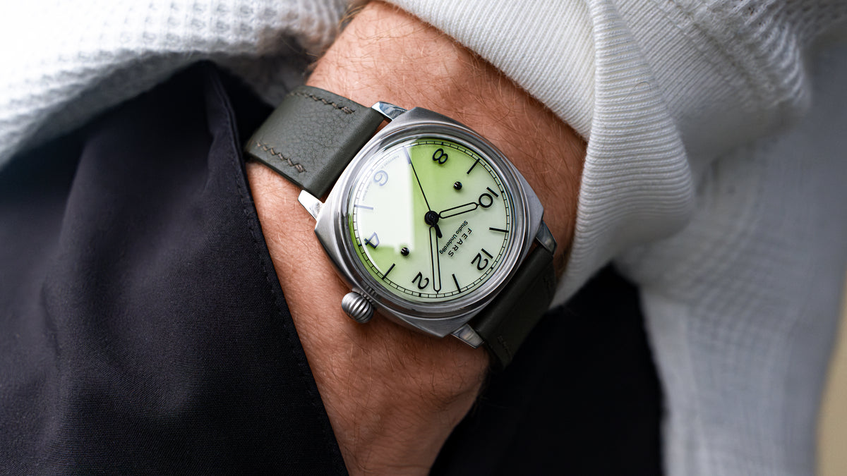 The pale green gradient dial has been achieved by using current-day machining techniques and modern materials. It is made up of a base dial featuring 7 layers of custom-made Super-LumiNova pigment. The application of this pigment is incredibly time-consuming as each layer must completely dry before the next is applied.