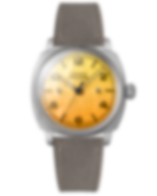 The multi-layer dial has been achieved by using current-day machining techniques and modern materials. It is made up of a sunburst silver base dial featuring a radial fumé, with a 1mm thick amber coloured sapphire disc atop. Once these two dials are affixed to one another via two slotted head pins, it creates a bold dial with a warm depth, akin to its namesake.